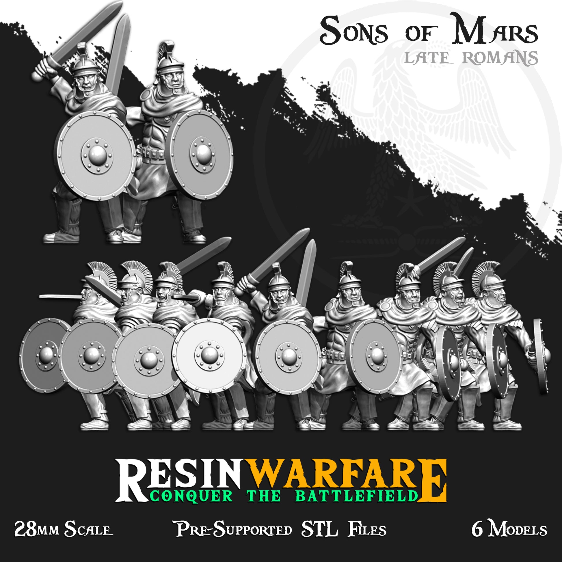A set of 6 28mm spear and swordsmen, with breastplate and plumed late Roman helmets. You'll be provided with a random selection of 3, or all 6 figures. They're provided with shields, and you'll receive a mix of pilum and gladius.