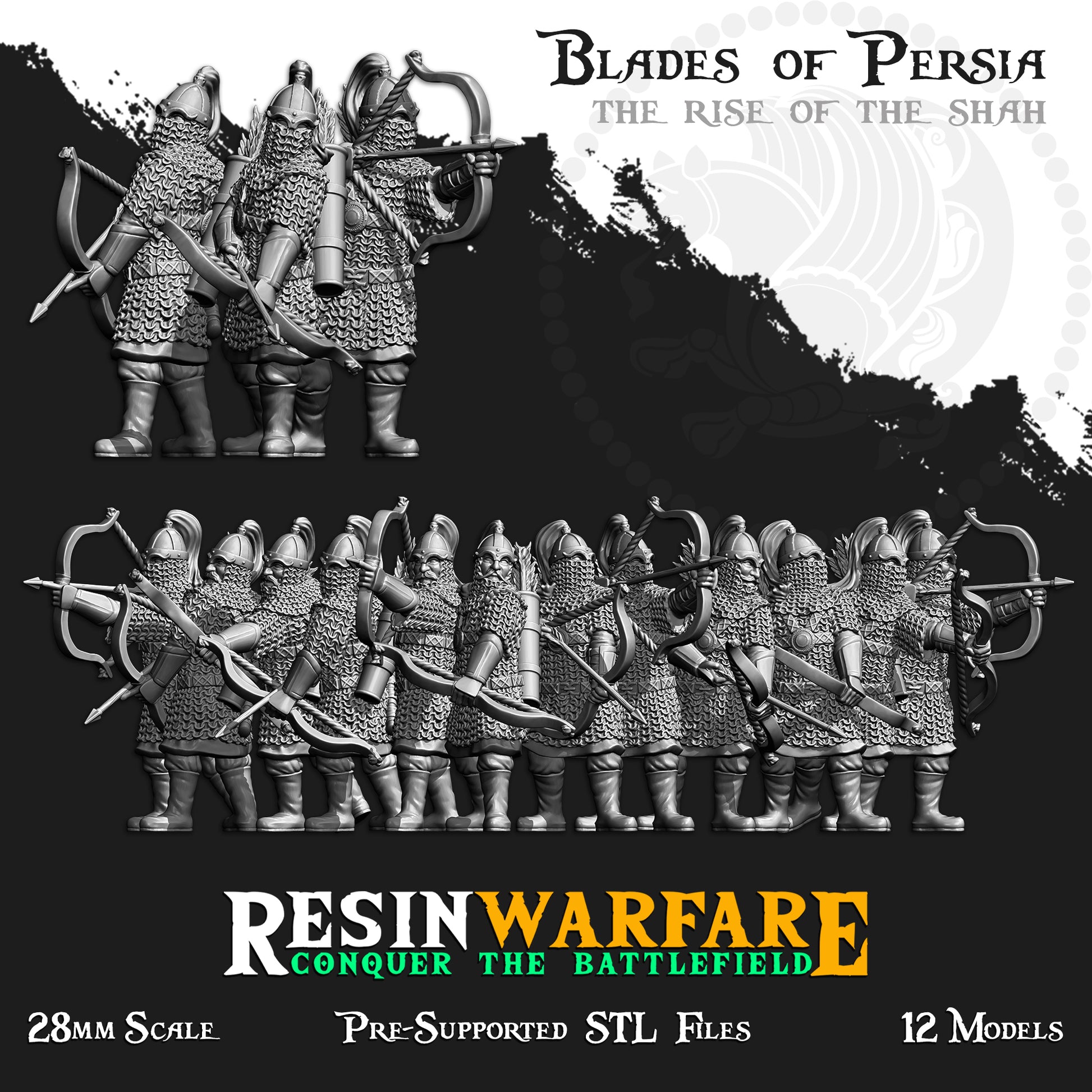 A set of 12 28mm archers in heavy armour. You can choose a randomised selection of 4, or 8, or all 12 models.