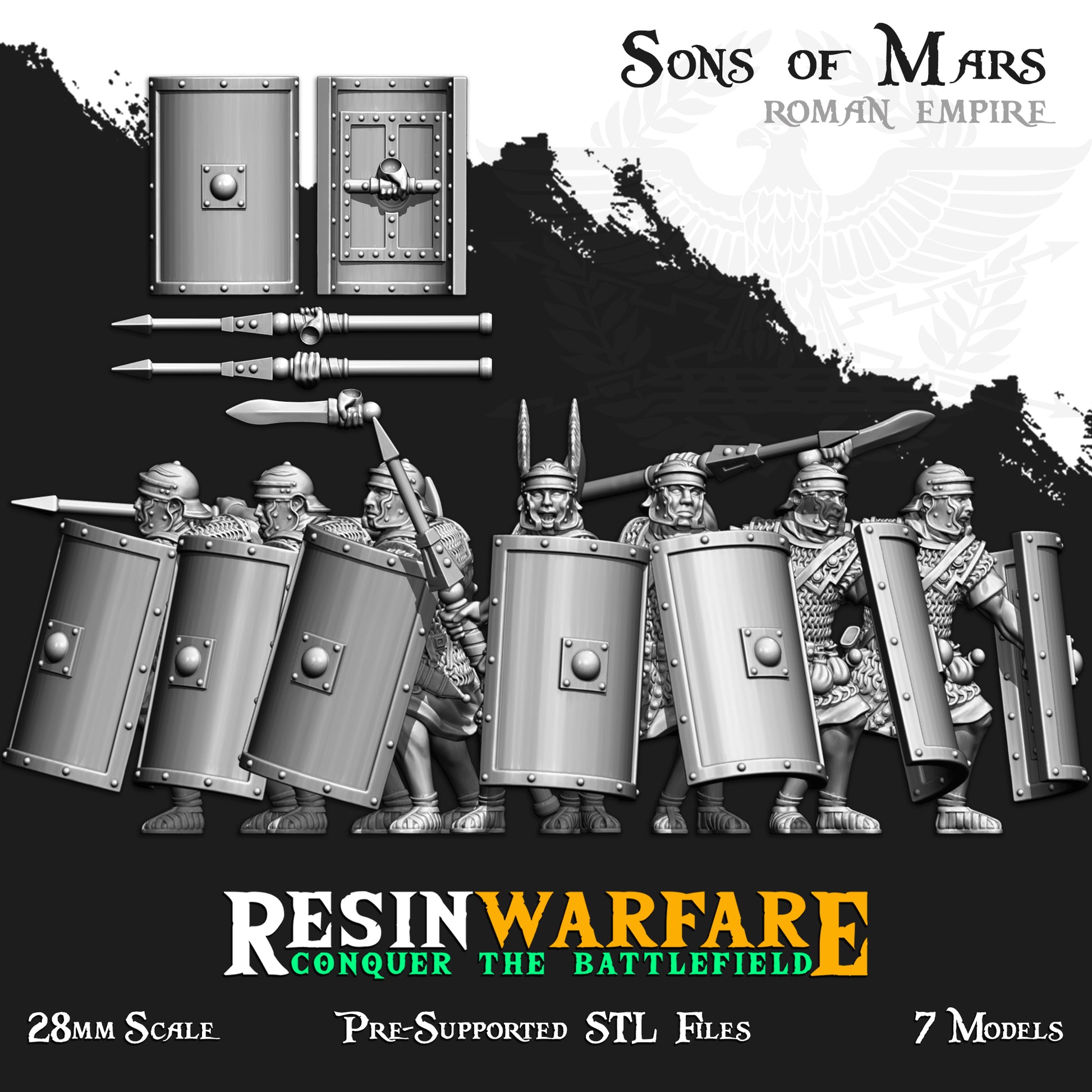 A set of 9 28mm spear and swordsmen, with chain mail armour and Marian Roman helmets. You'll be provided with a random selection of 3, 6, or all 7 figures including the Decanus (with the feathered helmet). They're provided with shields, and you'll receive a mix of pilum and gladius.