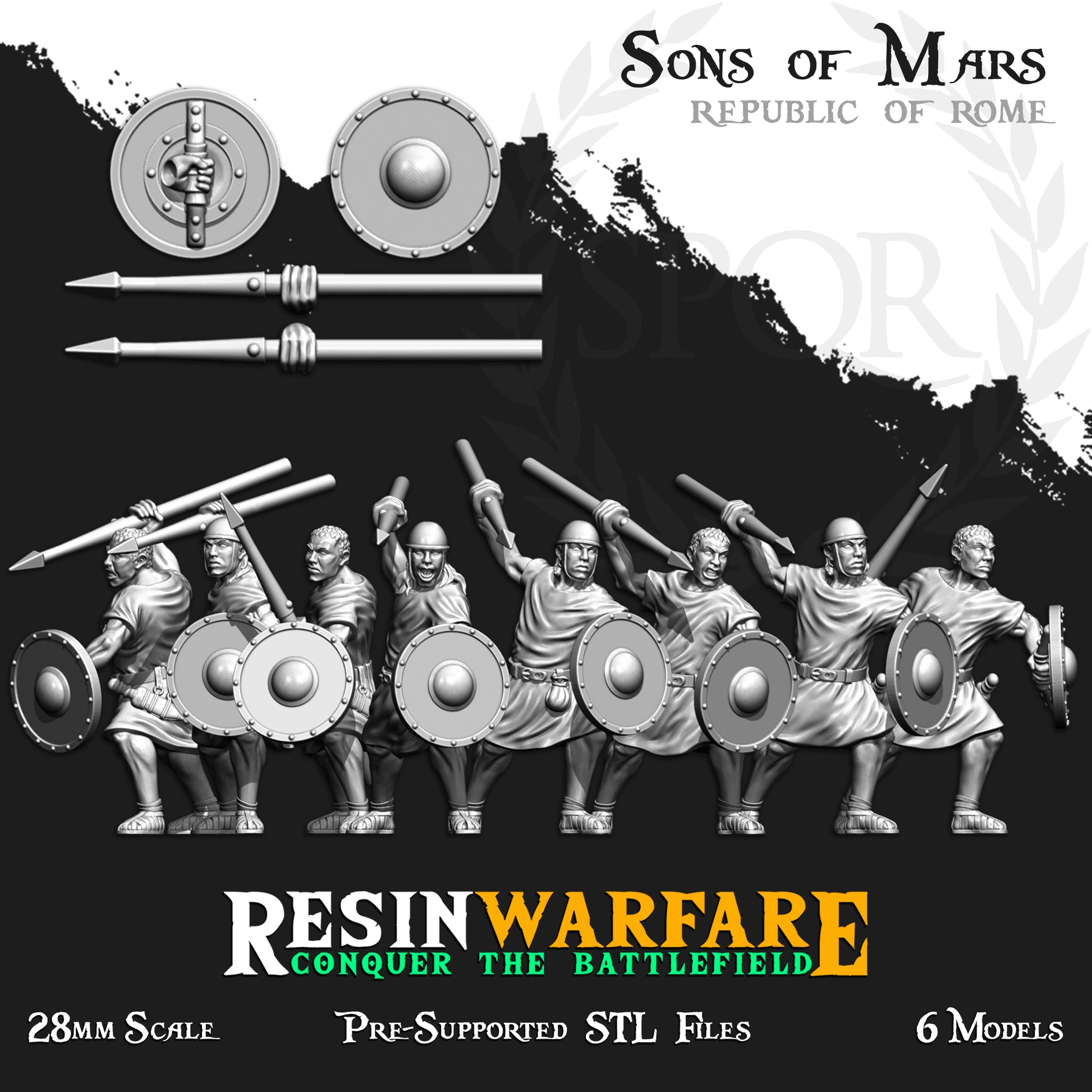 A set of six 28mm javelinmen. You'll be provided with a random selection of 3, or all 6 figures. They're provided with a mix of shields and weapons, which you can attach to the mini as you choose.