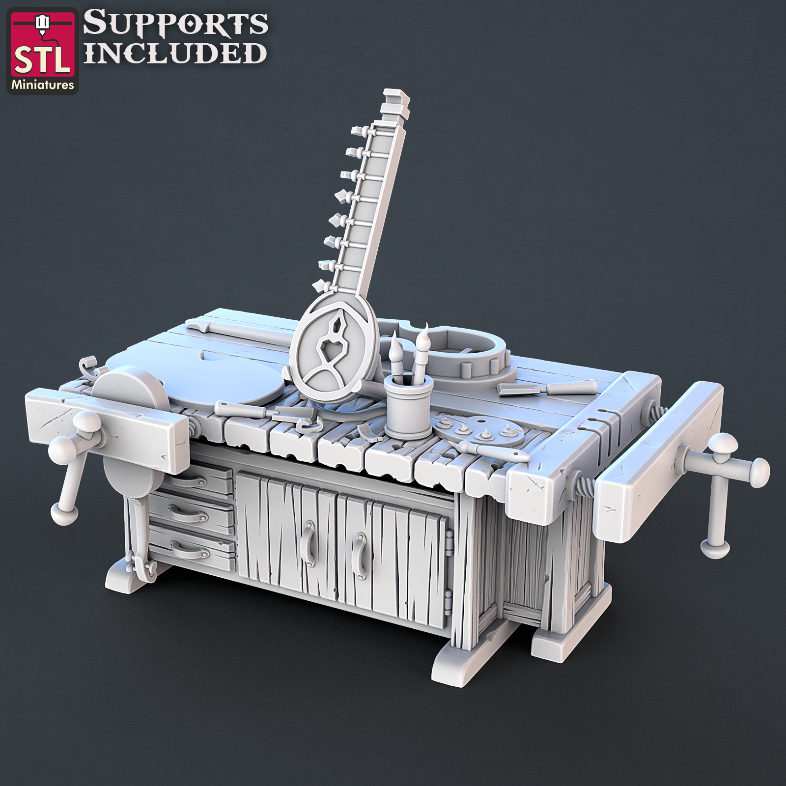 A workbench for the music a store. The bench and the instruments are provided separately, so you can make up the diorama as you please.