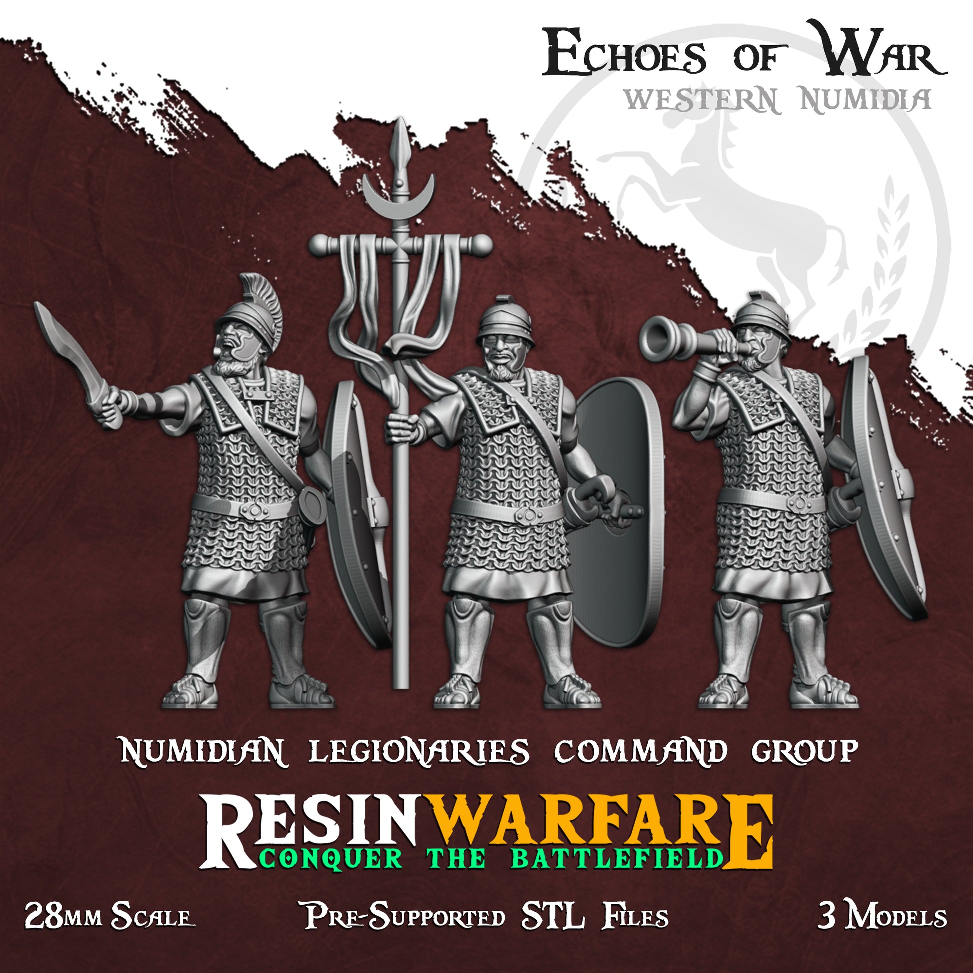 A 28mm command pack of three miniatures, officer, a musician, and standard.