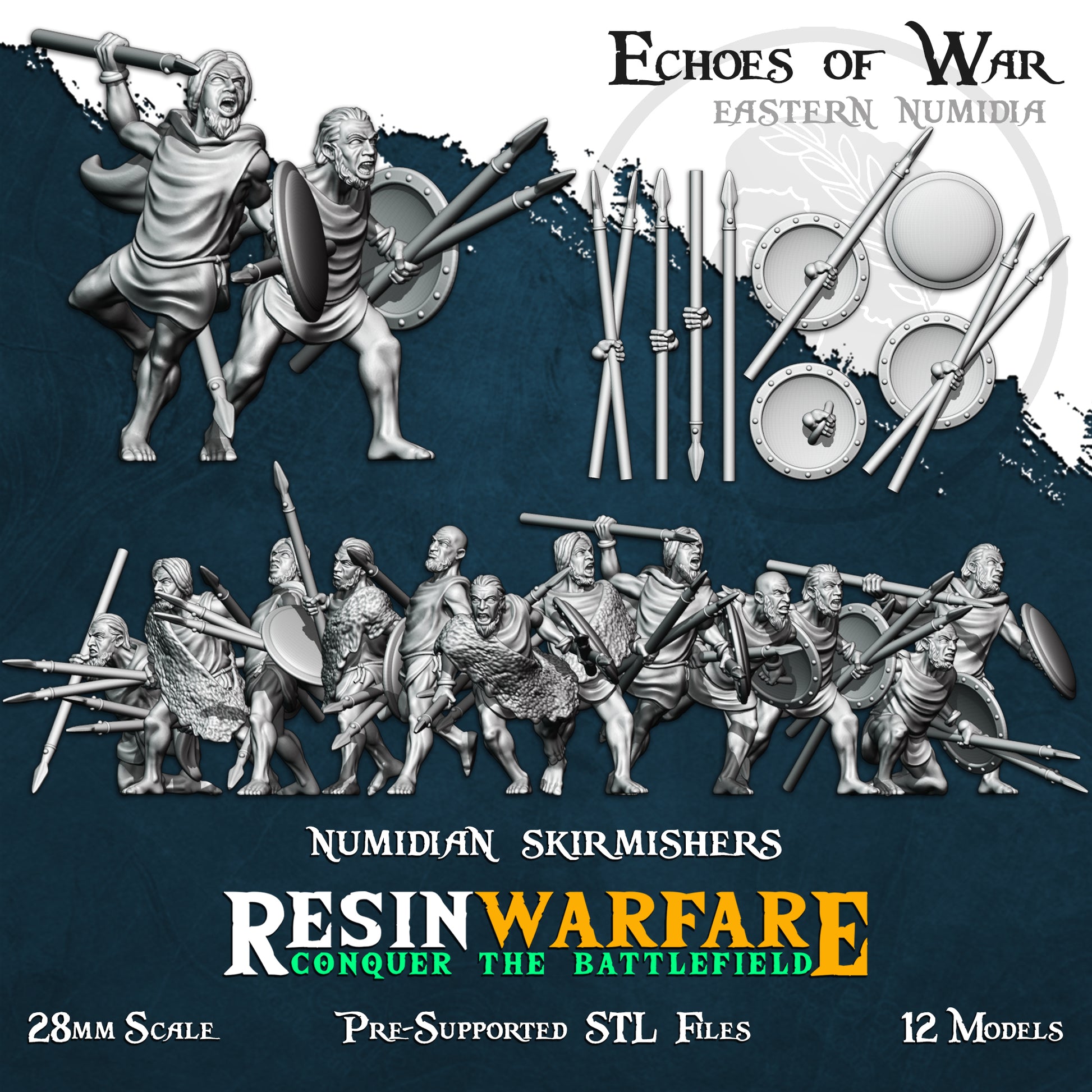 A selection of 12 different 28mm Numidian skirmisher with javelins. You'll receive a random selection of 4, 8, or all figures.
