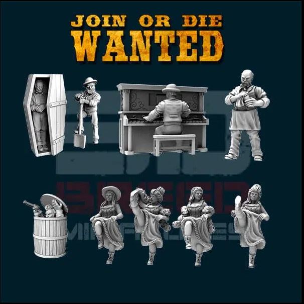 A collection of civilians for a bar scene, or colour for a Western town. The coffin, piano, and barrel are included in the set.