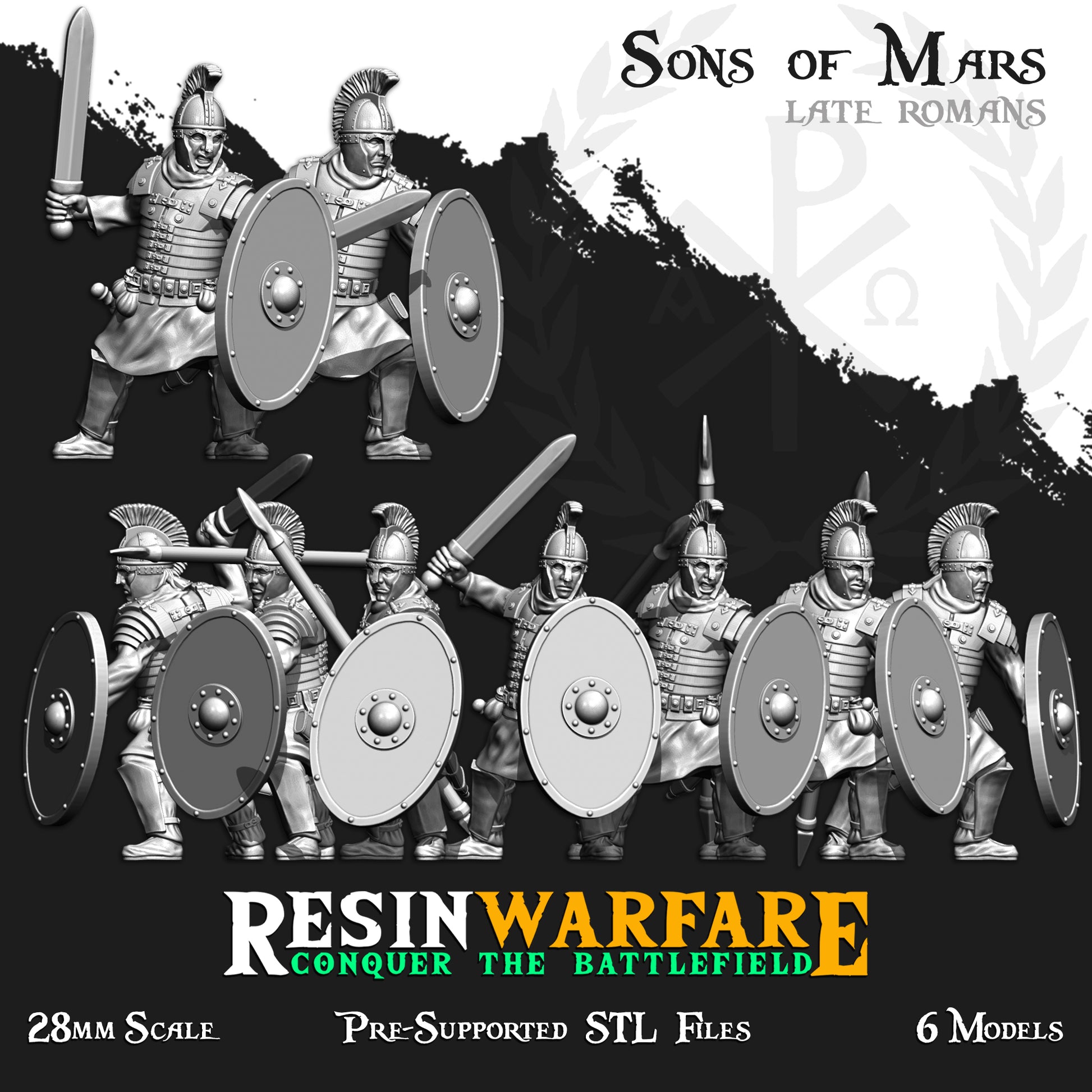 A set of 6 28mm spear and swordsmen, with banded armour and plumed late Roman helmets. You'll be provided with a random selection of 3, or all 6 figures. They're provided with shields, and you'll receive a mix of pilum and gladius.